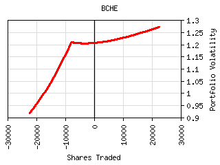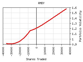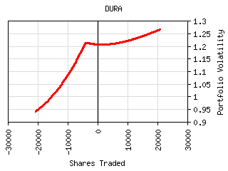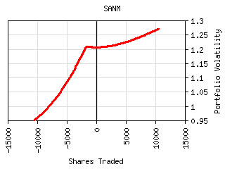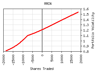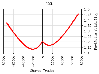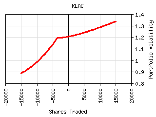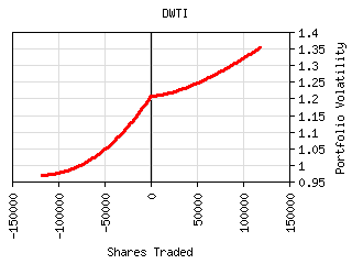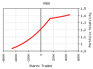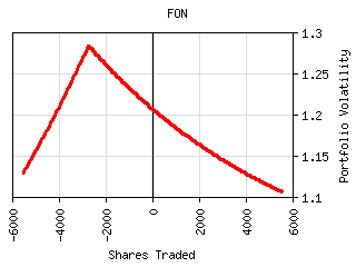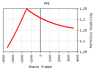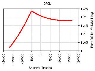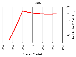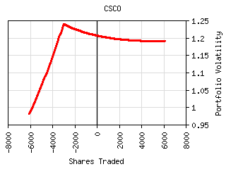 For most securities the plot of shares traded vs. portfolio volatility has a 'W' shaped curve as can be seen below. The central peak represents the portfolio volatility when the security is not held. The right valley in the curve represents the optimum long exposure to the security and the left valley represents the optimum short exposure. The outer legs represent over-exposure to the security. This curve is shifted left or right by the amount presently owned. It can be tilted or lopsided depending on the security and its interaction with the rest of the portfolio.